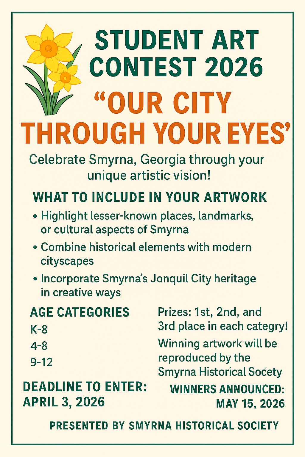 This contest encourages young artists to creatively express what Smyrna means to them by highlighting lesser-known landmarks, blending historical and modern elements, and incorporating Smyrna’s Jonquil City heritage.
